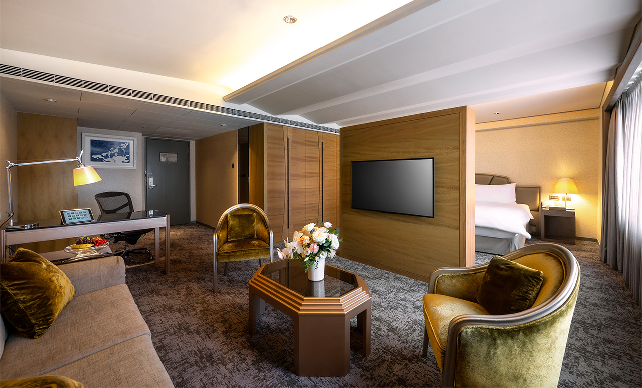 低調內斂設計、寬敞舒適的空間,營造優雅氛圍。King Size大床與舒適沙發,舒緩一天疲累,另可擴併隔鄰客房,組成家庭套房,享有更舒適寬敞的空間。